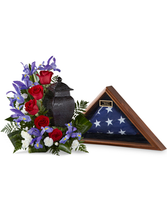 Give this bouquet at a funeral service to show your admiration for the brave men and women who have given their lives in service to their country. With classic red roses symbolizing courage and extreme bravery, and white carnations and sapphire-blue irises representing the American flag, the Patriotic Tribute is a moving reminder of our nation's pride and patriotism.